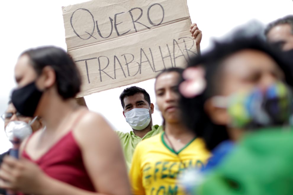 在首都巴西利亞(Brasilia),一場由商人發起的抗議正在進行中。他們反對巴西利亞聯邦特區首長羅查(Ibaneis Rocha)為了減緩COVID-19(武漢肺炎)疫情而施行的封城措施。畫面中,男子手上高舉的看板上寫著「我想工作」。