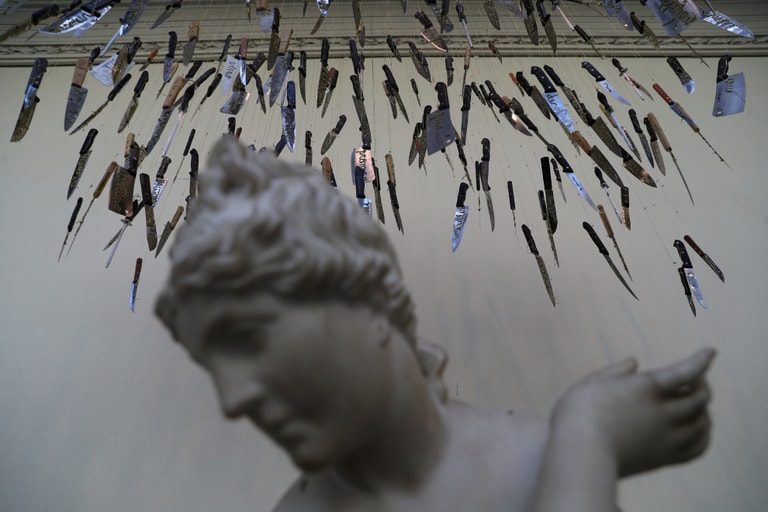 在首都聖地牙哥的國家美術館內,智利藝術家梅娜(Catalina Mena)在義大利雕塑家加澤里(Ernesto Gazzeri)的作品《跪姿維納斯》(Venus arrodillada)上方裝設了一把又一把的刀子,藉此隱喻家暴和人類的脆弱。