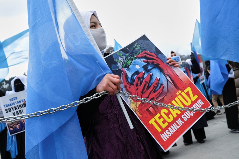 在國際婦女節這一天,來自維吾爾族的民眾齊聚在伊斯坦堡街頭,他們手拿寫有「性侵犯了危害人類罪」字樣的看板,抗議中國政府對新疆維吾爾族的迫害。