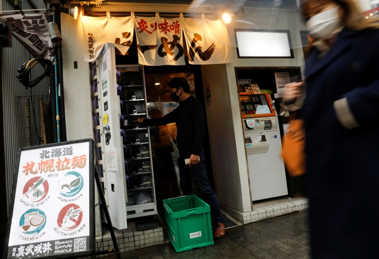 在東京澀谷區的一間拉麵店外,可以看到耳鼻喉科診所的工作人員正在替自動販賣機補貨,補的是COVID-19(武漢肺炎)病毒檢測組。