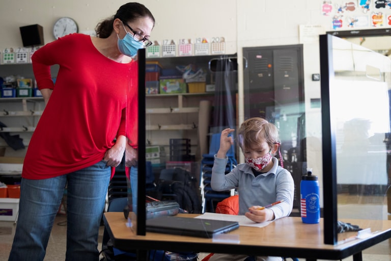 在賓州費城的一所學校內,一名戴著口罩的老師隔著隔板監督學生寫作業。