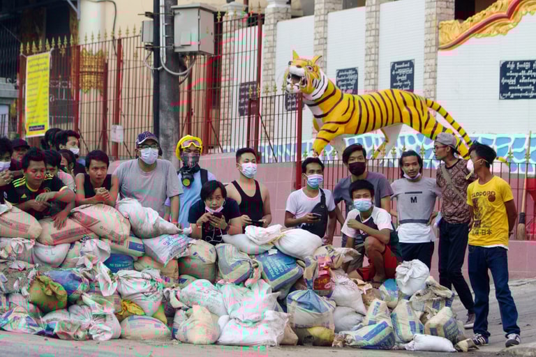 在緬甸大城仰光的三橋區,反對軍政府的民眾站在路障後,準備等待下一次與軍政府的衝突。