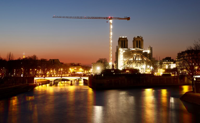 在巴黎西堤島(Île de la Cité)上,可以看到在 2019年4月遭火吻的巴黎聖母院正在加緊趕工重建。
