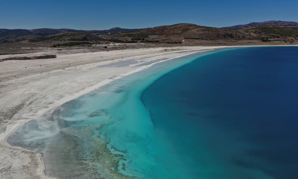 從空拍的角度,可以清楚看見薩爾達湖湛藍的湖面及白色的湖岸,這兩大特色也讓它有了「土耳其的馬爾地夫」(Turkey's Maldives)的別稱。