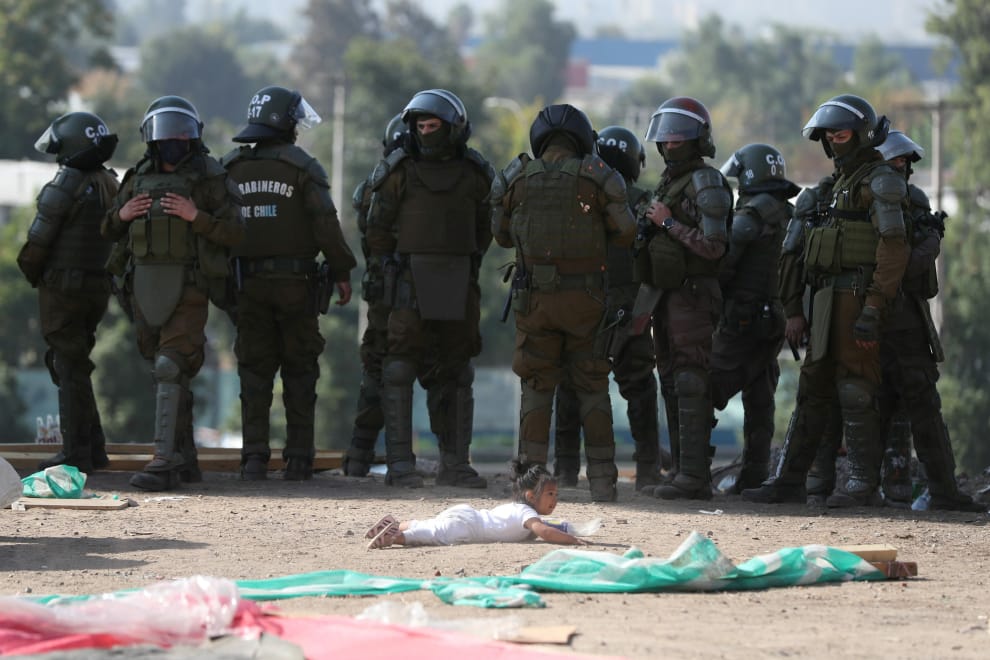 在首都聖地牙哥的外圍,鎮暴警察正在驅逐非法佔地建屋的民眾,他們在這裡雖然沒水沒電,但卻是少數能夠遮風擋雨的所在。而在警方的驅逐過程中,攝影師也用鏡頭捕捉到了孩子趴在地上的畫面。