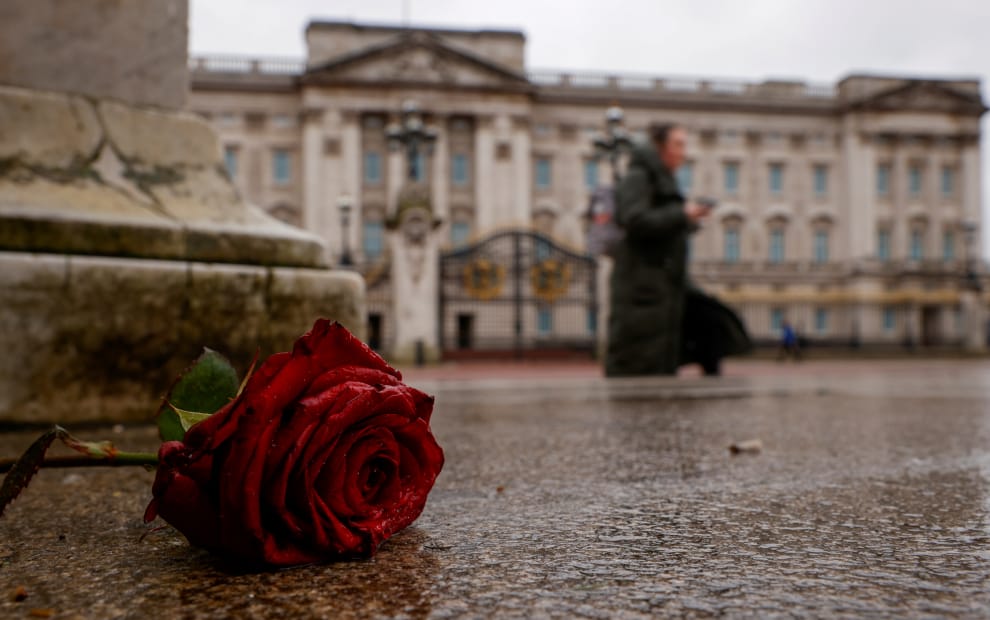 在倫敦白金漢宮前,躺著一朵紅色的玫瑰花。