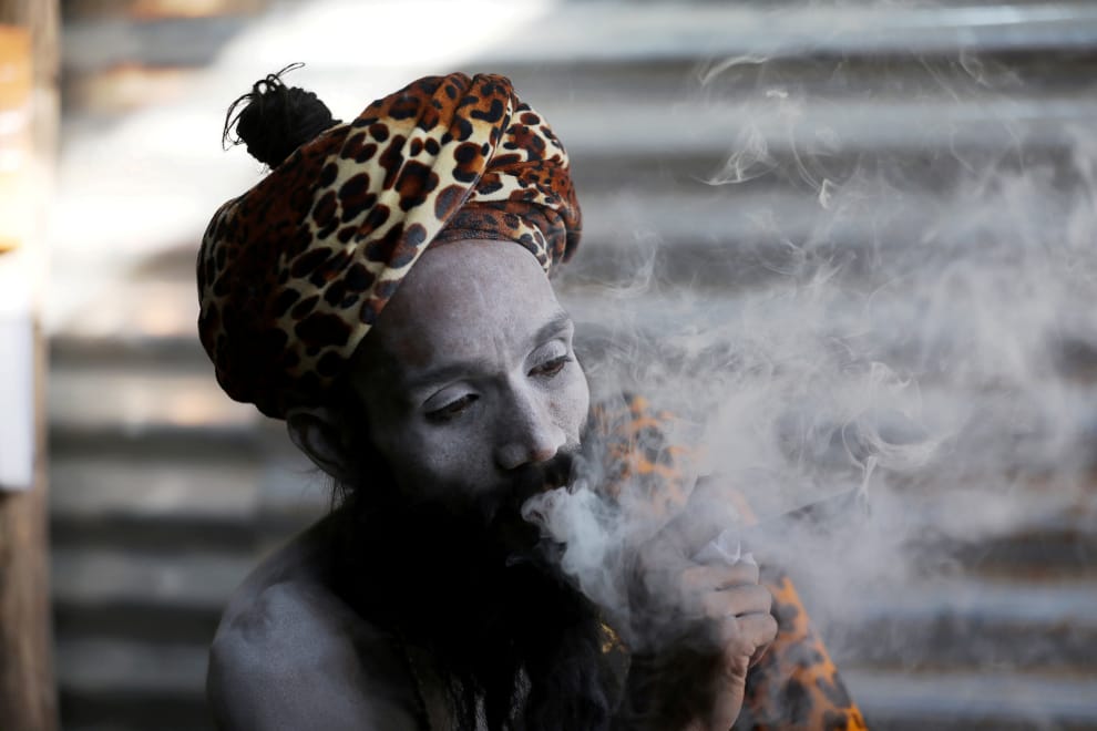 在北阿坎德邦的朝聖大城赫爾德瓦爾(Haridwar),一名印度教聖僧(Sadhu,又稱苦行僧)在參加沐浴洗禮(Shahi Snan)前先於帳篷內吞雲吐霧一番。這裡正在進行重要的宗教慶典大壺節(Kumbh Mela,也稱大壺節)。
