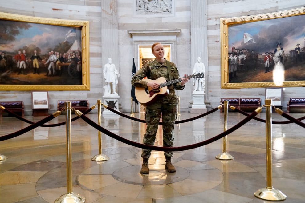 在國會山莊的圓頂大廳內,密西根州國民警衛隊中士博爾德(Hannah Boulder)正在自彈自唱。