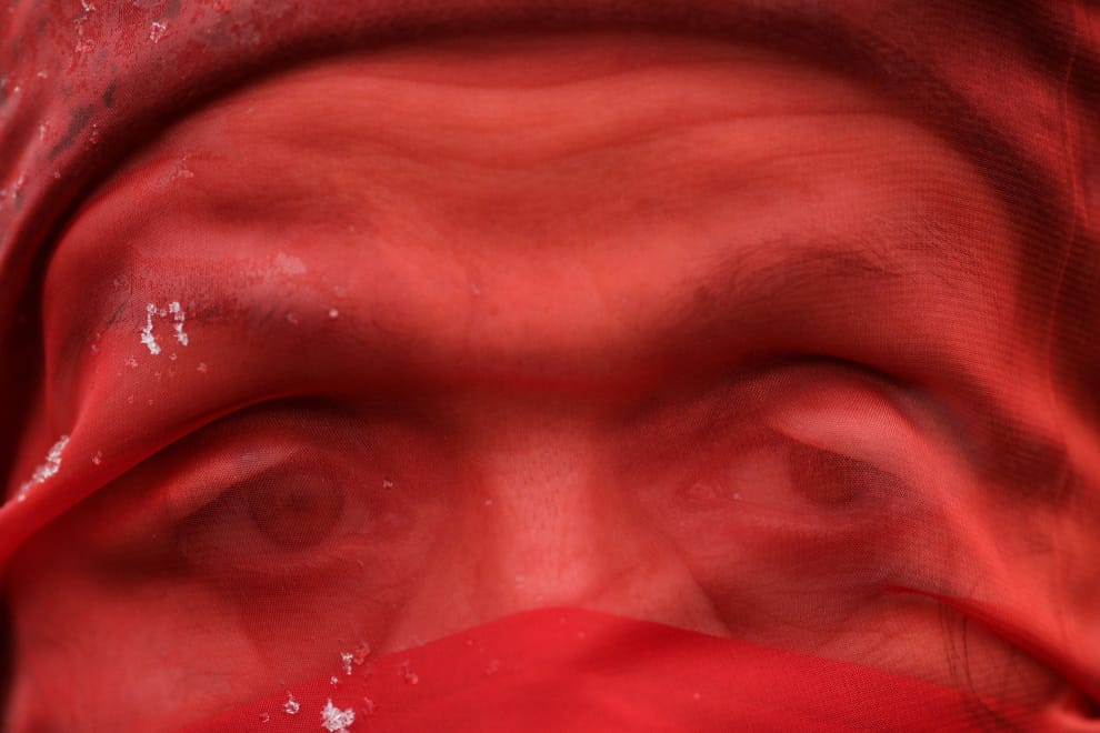 在首都布加勒斯特的羅馬尼亞國會前,一名女子罩著紅色圍巾加入快閃活動的行列,和其他示威民眾一塊呼籲政府盡快通過新法,替家暴前科者配戴監視器。