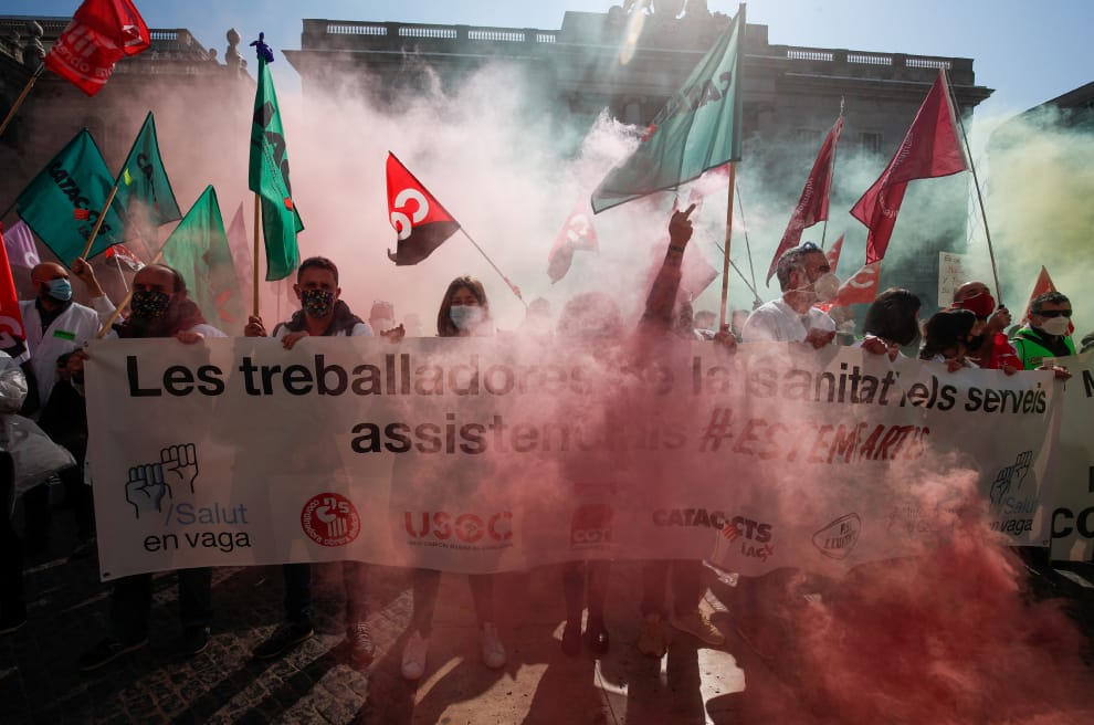 在巴塞隆納的聖若梅廣場(Sant Jaume square),不堪勞動環境血汗的醫護人員手拿旗幟抗議,旗幟上寫著「醫護人員受夠了!」。