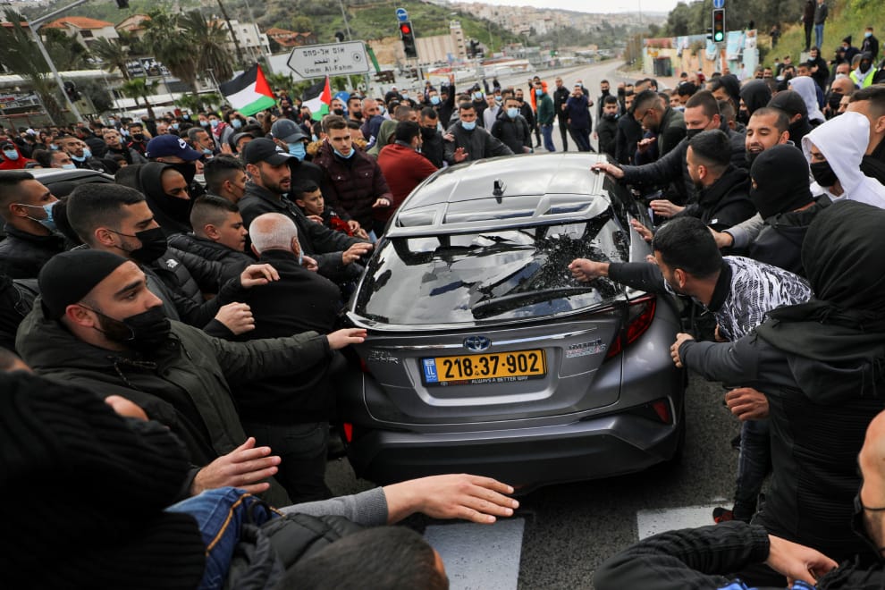 在以色列北方城市烏姆阿法姆(Umm el Fahm),阿拉伯裔以色列民眾紛紛攻擊一輛開過示威現場的汽車,他們正在當地抗議警察守護治安不力,對當地層出不窮的犯罪事件睜一隻眼,閉一隻眼。