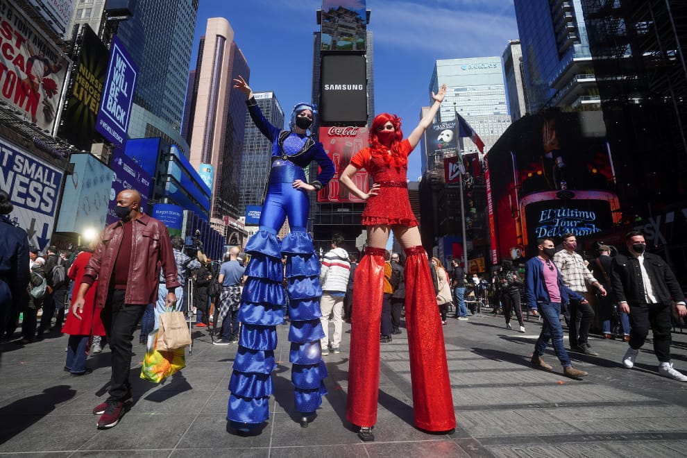 在紐約時代廣場,藝術工作者踩著高蹺參加快閃百老匯活動,慶祝即將重啟的百老匯劇場。