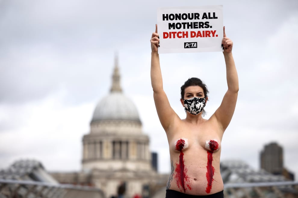 在倫敦千禧橋上,善待動物組織(PETA)運動人士伍德(Daniella Wood)高舉寫有「尊敬所有母親,丟棄乳製品」字樣的牌子,反對乳製品工業的存在。