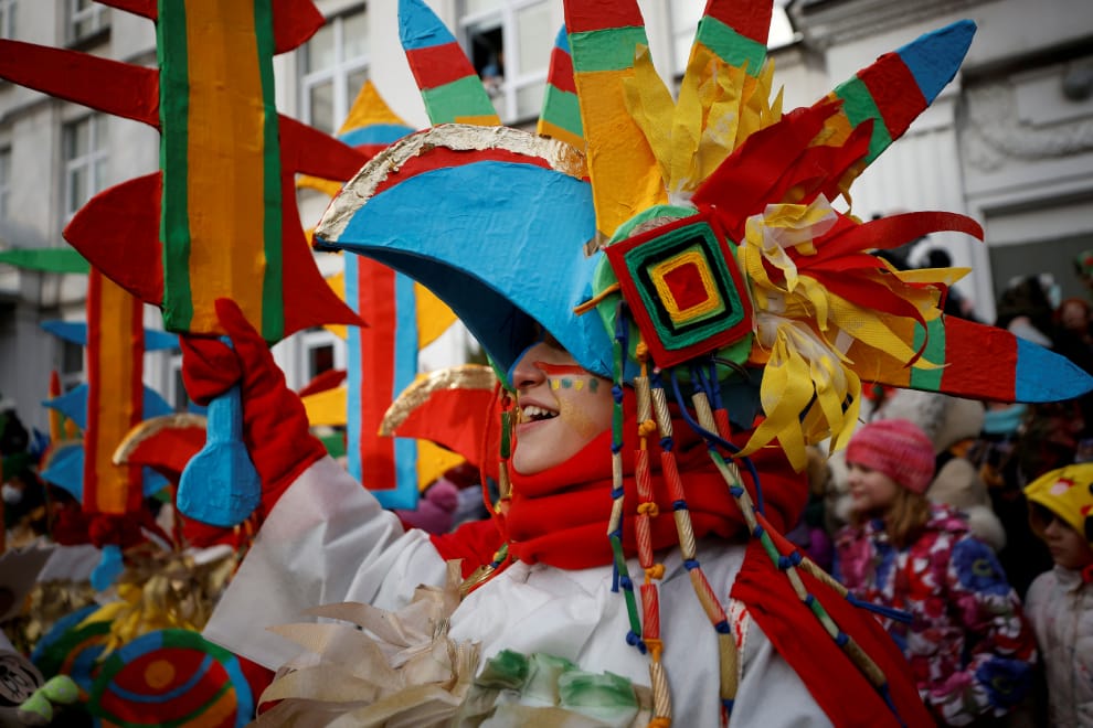 在首都莫斯科一年一度的送冬節(Maslenitsa,又稱謝肉節,烤薄餅周)上,當地學校的師生們穿上五彩繽紛的戲服參與表演。