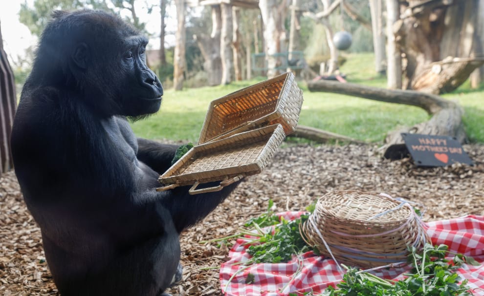 眼看英國母親節(3月14日)的腳步越來越近,倫敦動物園特別邀請西部低地大猩猩(Western lowland gorilla)媽媽Mjukuu一塊來拍攝慶祝廣告。