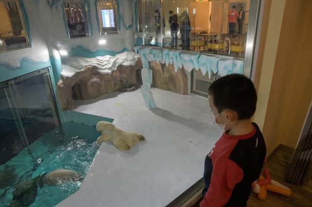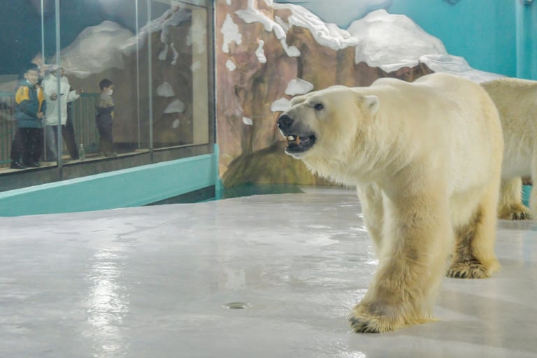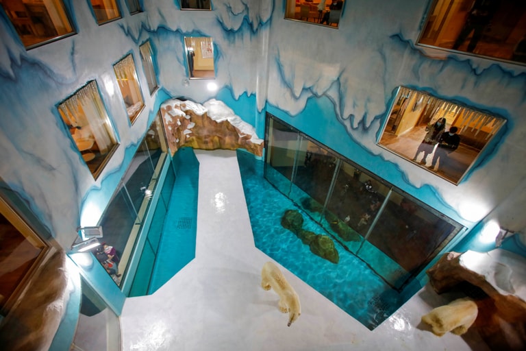 在黑龍江省的哈爾濱,哈爾濱極地公園自 2005年開幕以來,都以自己是「全世界第一個極地表演藝術的遊樂園」做為賣點。上周五(12),它們更進一步地發展了新主題:北極熊旅館,也就是讓 21間飯店客房圍繞著一個住著 2隻北極熊的房間,讓旅客可以跟北極熊「住在一起」。