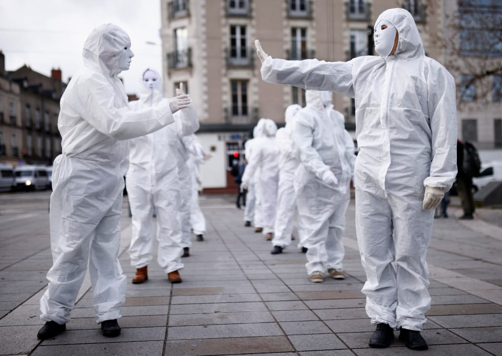 在法國西部大城南特(Nantes),來自白面具社運組織的成員正在上演一場抗議政府防疫措施的表演。同時,他們也一塊參與當地正在進行的示威活動,共同反對當局力推的《全球安全法案》(Global Security Bill)。