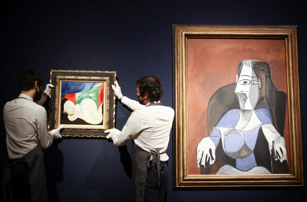 在佳士得拍賣行(Christie's auction house)內,工作人員正在調整西班牙藝術家畢卡索(Pablo Picasso)的畫作。