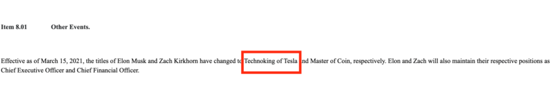 網友Steve Jurvetson據 CNBC 報導,特斯拉(Tesla)15 日提交美國證券交易委員會的文件,指出從 2021 年 3 月 15 日起,執行長馬斯克的頭銜改為「Technoking of Tesla」;財務長 Zachary Kirkhorn 改為 Master of Coin。