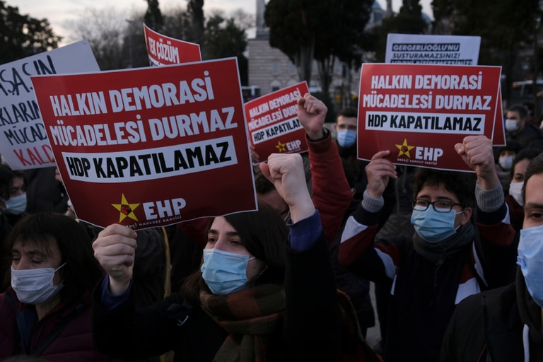 在伊斯坦堡街頭,支持親庫德族人「人民民主黨」(Peoples' Democratic Party, HDP)的民眾上街抗議,反對當局打算要求憲法法庭下令該黨解散,他們手舉著寫有「人民為民主不停奮鬥,『人民民主黨』不能解散」字樣的海報抗議。