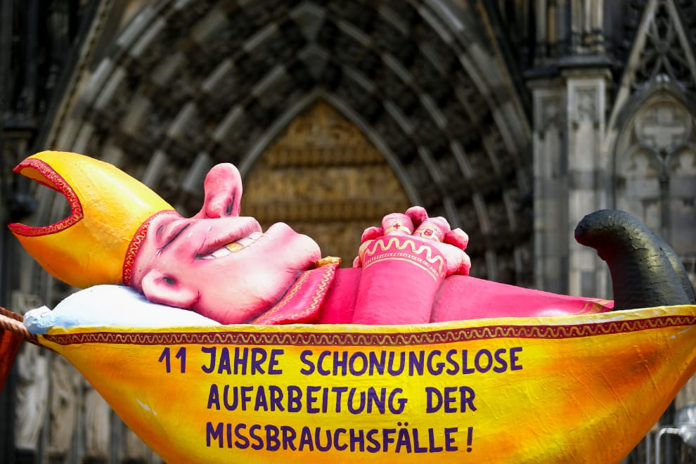 在科隆大教堂前,非營利基金會焦爾達諾·布魯諾(Giordano Bruno)的工作人員將巨型裝置藝術運到教堂前,抗議天主教會頻傳的神父性虐案。