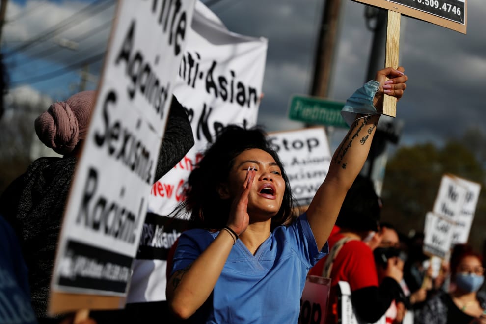 在喬治亞州首府亞特蘭大,聲援亞裔受害者的民眾上街示威,希望整個社會能重視近日亞裔民眾遭到攻擊的事件。