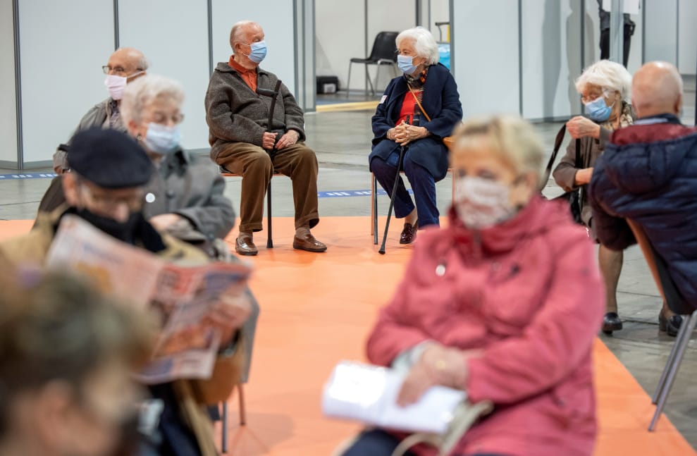 在位於布魯塞爾的疫苗接種中心內,前國王阿爾貝二世(King Albert II,左)和前王后寶拉(Queen Paola,右)正在排隊等待注射COVID-19(武漢肺炎)疫苗。