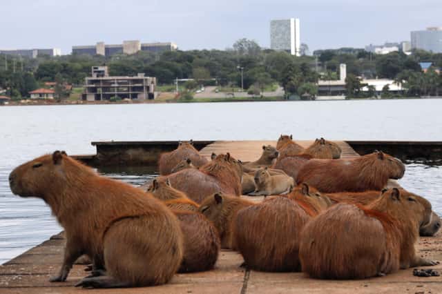 在巴西首都巴西利亞的人工湖帕拉諾阿湖(Paranoá Lake),一群水豚慵懶地在碼頭邊曬太陽,舒服的模樣羨煞眾人。