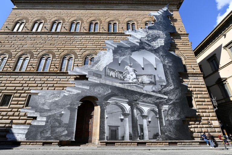 在佛羅倫斯的斯特羅齊宮(Palazzo Strozzi),法國現代藝術家JR透過外牆佈置讓人一窺宮殿的內部,這幅作品也被他命名為《傷口》。