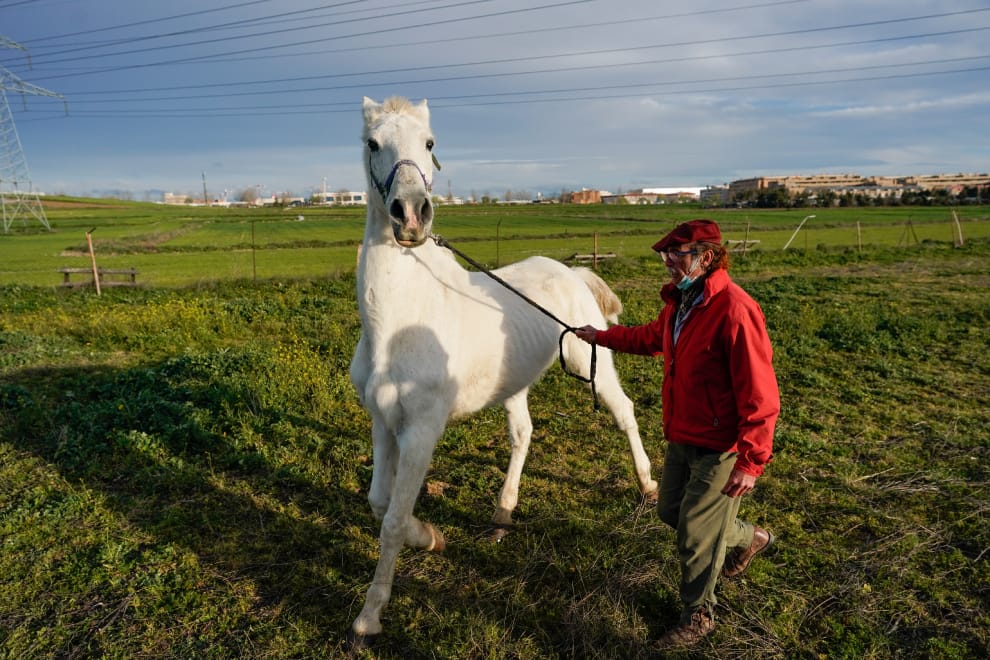 在馬德里自治區的萊加內斯市(Leganes),來自非政府組織「拯救馬兒」的成員諾艾爾斯(Fernando Noailles)正在和一匹剛獲救的馬兒培養感情。