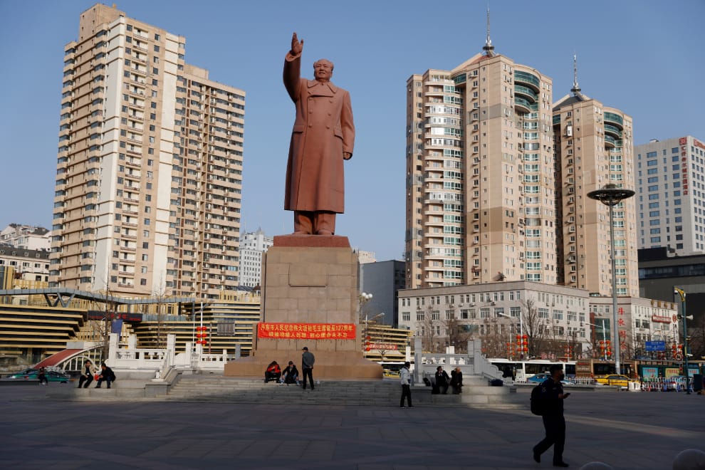 在遼寧省和北韓新義州市接壤的丹東市火車站外,可以看到已故中國領導人毛澤東的雕像。