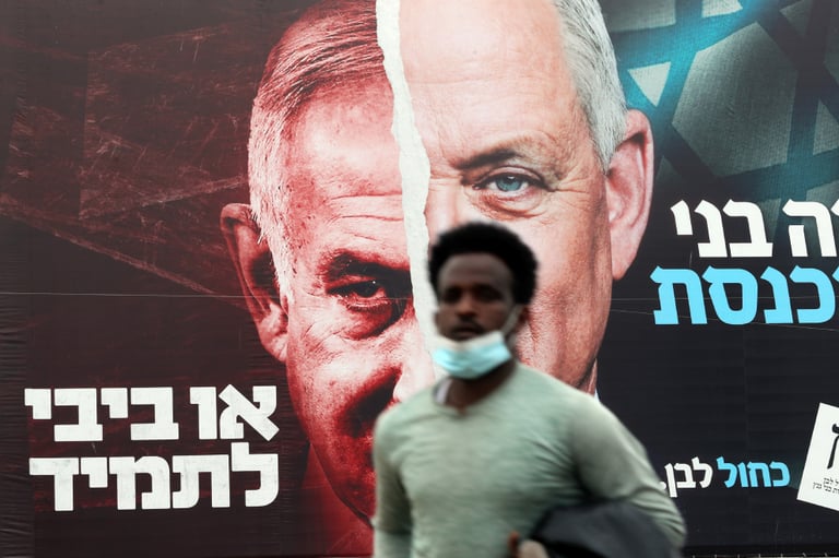 在以色列特拉維夫市附近的貝內貝拉克(Bnei Brak),一名男子行經一面大型廣告看板,上頭畫著現任以色列總理納坦雅虎(Benjamin Netanyahu,左),和他在本次大選中的對手兼現任以色列國防部長甘茨(Benny Gantz,右)。