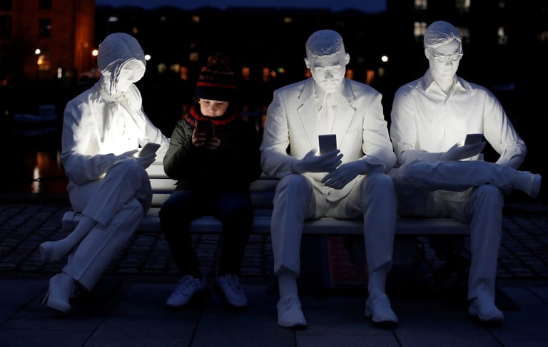在英國中部的利物浦市(Liverpool),小男孩在藝術家盧卡斯(Gali May Lucas)的雕像作品《被光吸收》(Absorbed By Light)中間找了個位置坐下,跟兩旁的雕像一起滑手機。
