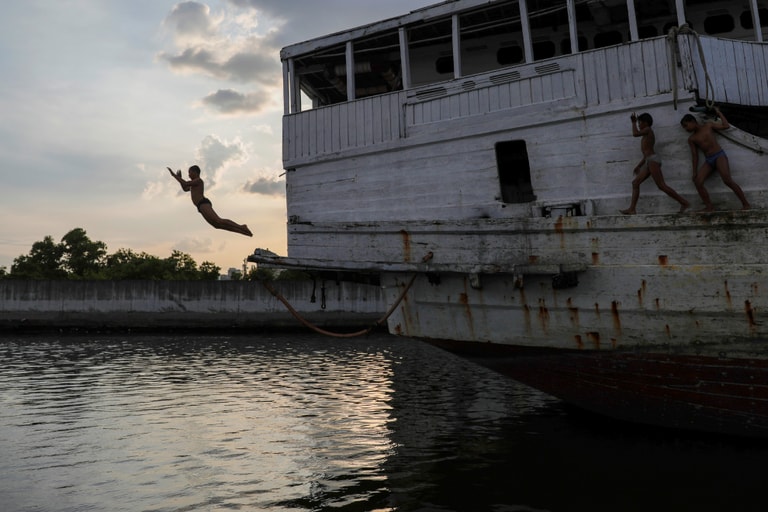 在印尼首都雅加達附近的的巽他格拉巴港(Sunda Kelapa port)中,一名男孩在世界水資源日這天跳入海中。