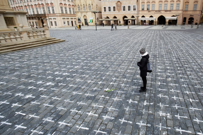 在捷克首都布拉格的老城廣場(Old Town Square),有藝術家在廣場地面上畫了大量十字架,用來悼念那些在COVID-19(武漢肺炎)疫情中死去的人們。當圖片中的女性經過老城廣場時,她也忍不住低下頭來,哀悼這些已經不在世上的人們。