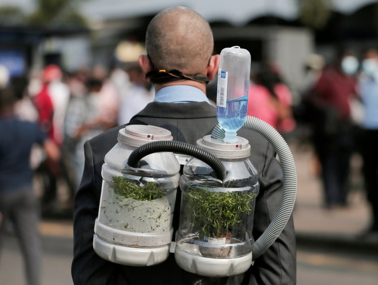 在斯里蘭卡首都可倫坡(Colombo),一名環保人士準備了一套特殊的裝置,藉此強調隨著科技演進,未來人類有望從瓶子裡的一棵樹木上,就能獲得充足的氧氣,以抗議斯里蘭卡政府最近在島上野生動物主要棲息的森林中大舉伐林的作法。