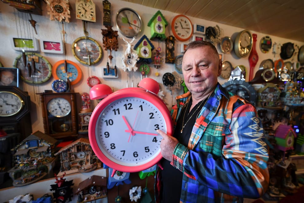 在德國大城慕尼黑(Munich)的公寓裡,時鐘收藏家史提克巴斯(Werner Stechbarth)向攝影師展示他超過 500多個時鐘收藏當中的一個。