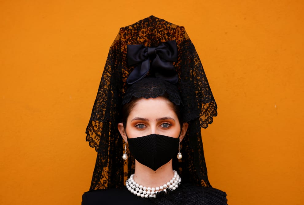 在西班牙安達魯西亞自治區首府塞維亞(Seville),現年 18歲的模特兒坎塔雷爾(Marina Cantarell)披上設計師發揮巧思,改造出的新版西班牙傳統頭紗「曼蒂莉亞」(Mantilla)。