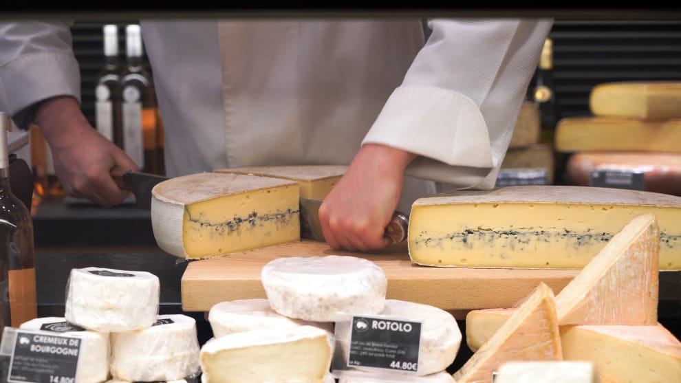 在法國首都巴黎東南部的茹安維爾勒蓬市(Joinville-le-Pont),一名超市的工作人員正在準備當天要販賣的起司。