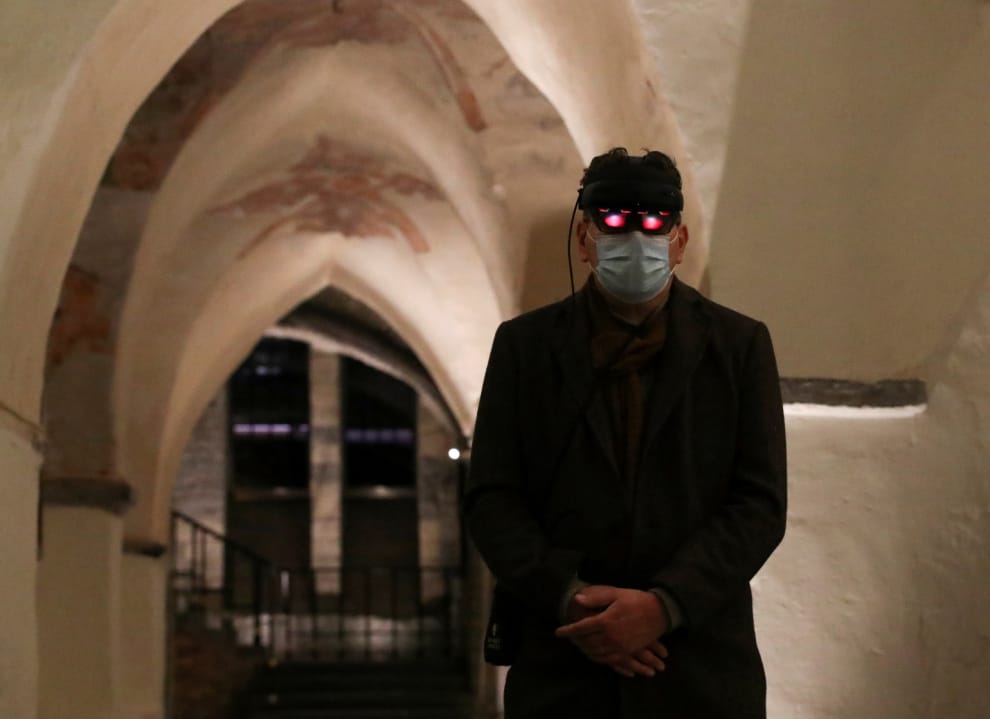 在比利時大城根特市(Ghen)的聖巴夫主教座堂(St Bavo's Cathedral),一名遊客正在用VR設備欣賞 15世紀法蘭德斯地區(Flanders)藝術大師范艾克(Jan Van Eyck)的名作《根特祭壇畫》(Ghent Altarpiece)。