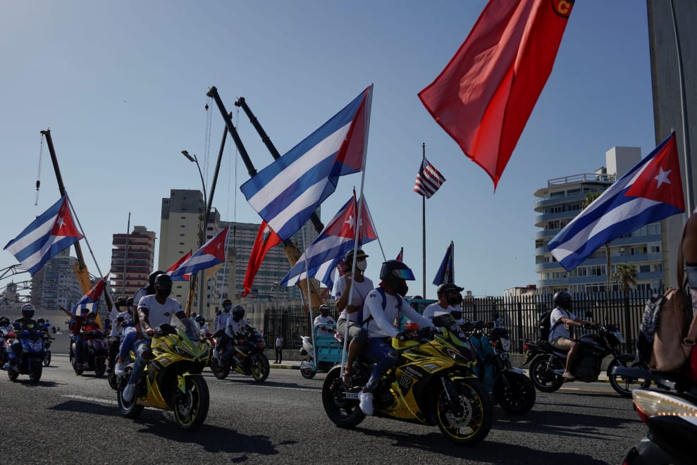 在古巴首都哈瓦那(Havana)的美國大使館外,民眾騎著機車、帶上古巴國旗到此發動遊行,抗議美國對古巴施加的禁運政策。