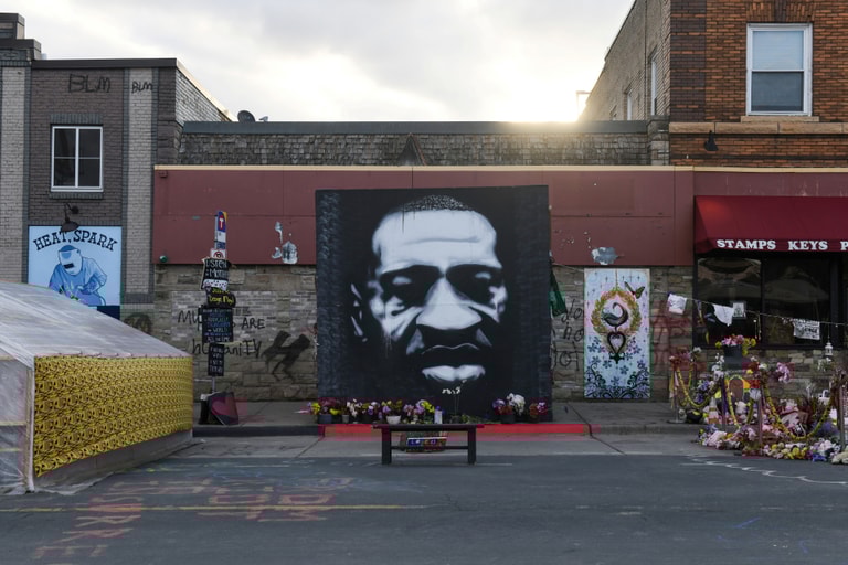 在美國明尼蘇達州明尼亞波利斯市(Minneapolis)的佛洛伊德廣場(George Floyd Square),28號這天是法院審判涉嫌謀殺佛洛伊德的警察沙文(Derek Chauvin)的前夕,人們在此擺上鮮花,悼念死去的佛洛伊德。