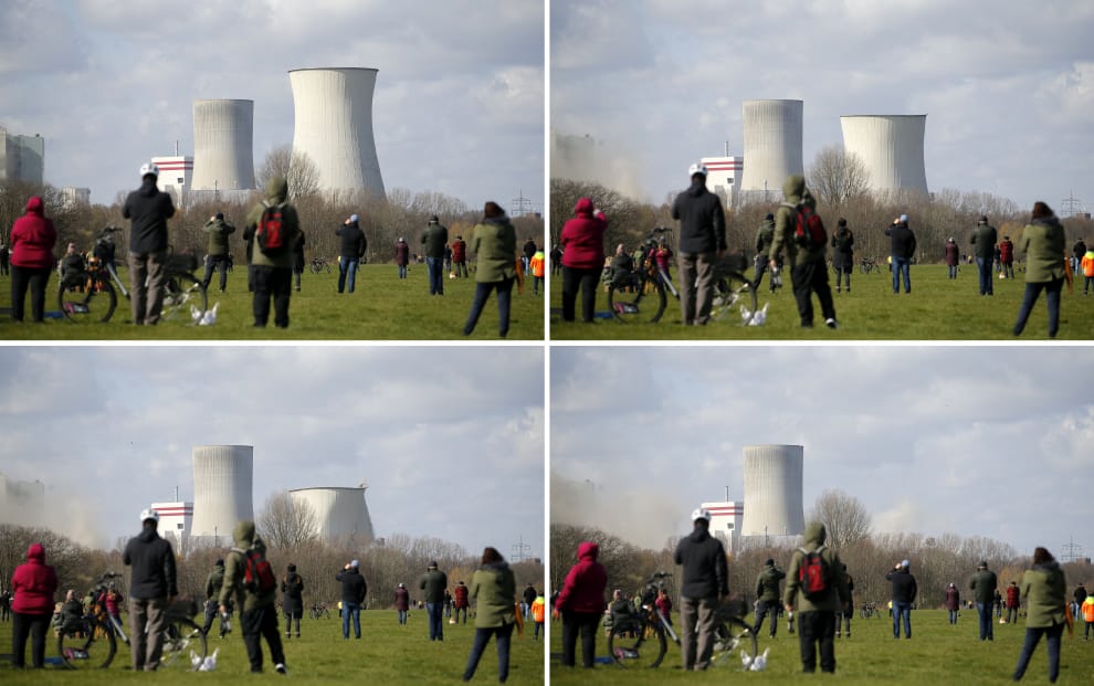 在德國西半部的呂嫩鎮(Luenen),民眾齊聚在草地上,觀看當局爆破、拆除當地的一座火力發電廠。