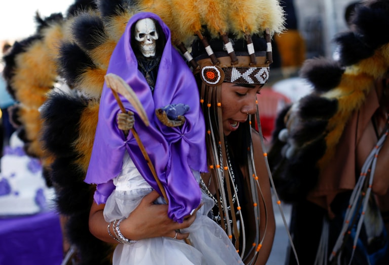 在位於美墨邊界的華瑞茲城(Ciudad Juarez),一名馬塔欽舞(matachin)的舞者在聖周(Holy Week celebration)期間,拿著一尊死亡聖神(Santa Muerte)的神像在街上跳舞。
