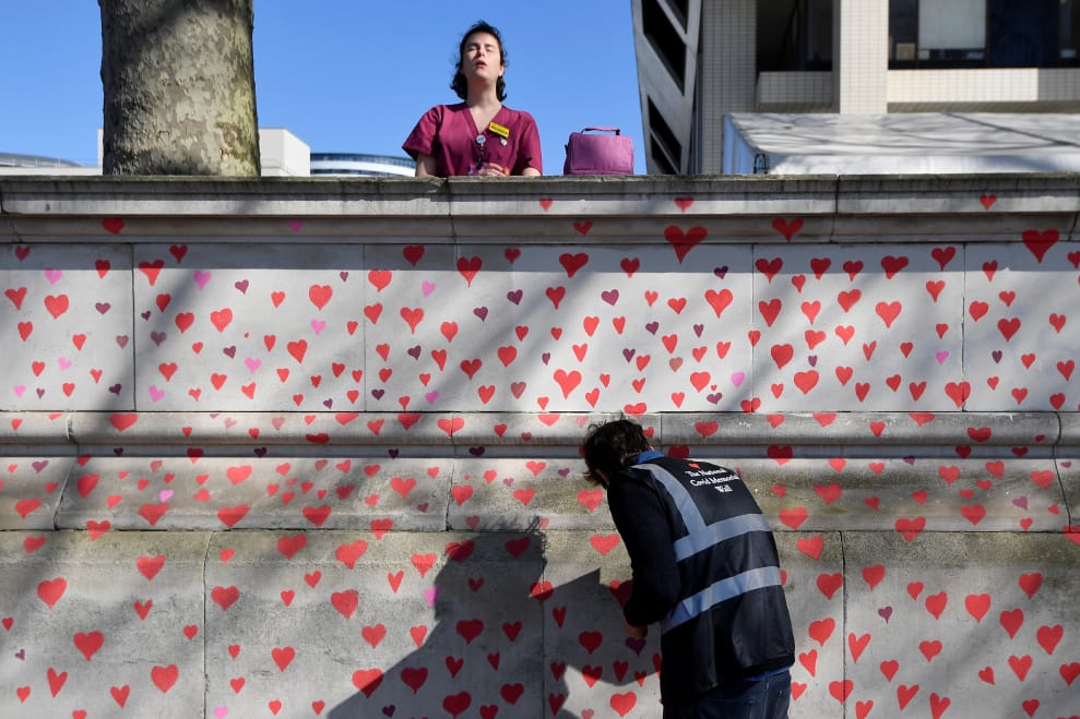 在英國首都倫敦,一名男子在聖湯瑪斯醫院(St Thomas' hospital)的外牆上畫滿愛心,紀念那些因罹患COVID-19(武漢肺炎)而離世的病患。同一時間,一名醫護人員恰巧從牆上探出頭來。