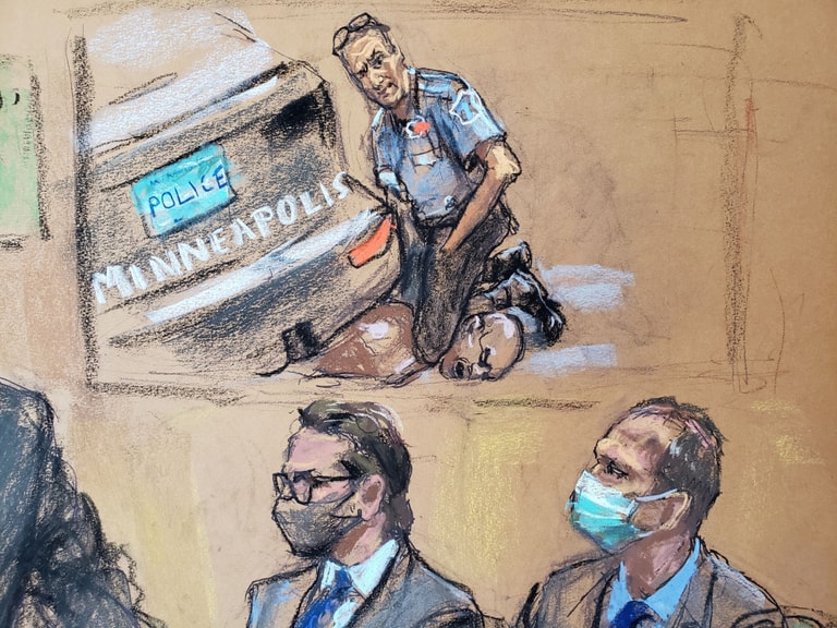 在美國明尼蘇達州的明尼亞波利斯市(Minneapolis),法庭畫家畫下法庭現場播放黑人男子佛洛伊德(George Floyd)遭白人警察沙文(Derek Chauvin)以膝蓋壓頸致死的畫面。影片前方兩人分別是沙文(右),和他的辯護律師納爾遜(Eric Nelson,左)。