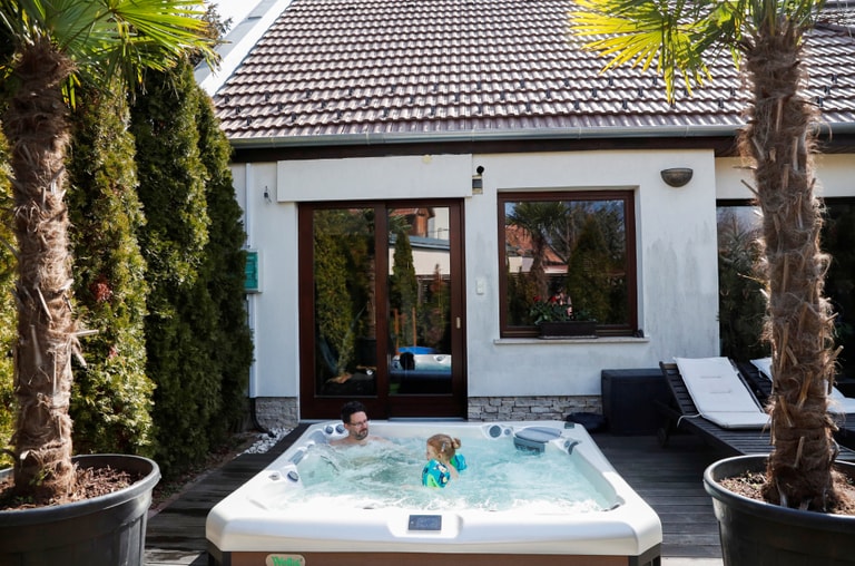 在匈牙利首都布達佩斯(Budapest),昆特納(Gabor Kuntner)一臉享受地和女兒琳達(Linda)一起泡在家裡新添購的大型溫水浴缸裡。