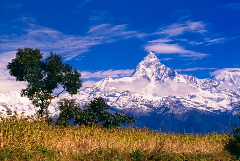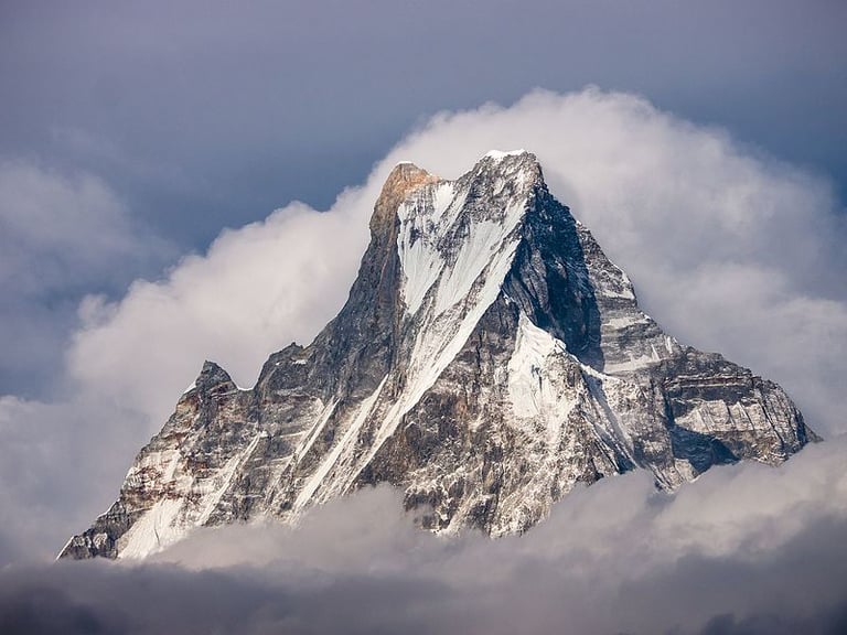 「魚尾峰」(Machhapuchhare)位於尼泊爾中部的城市博卡拉(Pokhara)附近,海拔約 6,993公尺高。它的名字來自於整座山峰的外型,從遠處望去,魚尾峰的形狀就彷彿一條魚的尾巴一樣。
