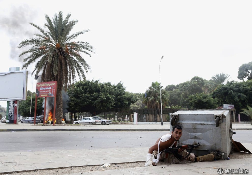 利比亞軍人拿著武器找掩護,他們正和當地的伊斯蘭教軍事組織發生衝突,當地在周一(25)時的衝突中釀成至少3人死亡數十人受傷