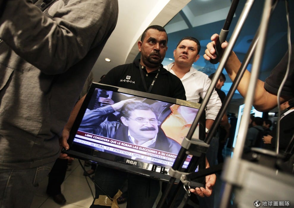 一名攝影助理扛著電視機,上面的人像是被推翻、宏都拉斯前總理札爾拉亞(Manuel Zelaya)。上週日宏都拉斯進行大選,當地的保守派陣營說他們贏得大選,但同一時間左派為主的黨派也表示勝選。根據宏都拉斯的選舉單位表示,部分選票的統計顯示,國家黨的何南迪斯(Juan Hernandez)以34.3%領先,而札爾拉亞的太太卡斯楚(Xiomara Castro)則以28.7落後